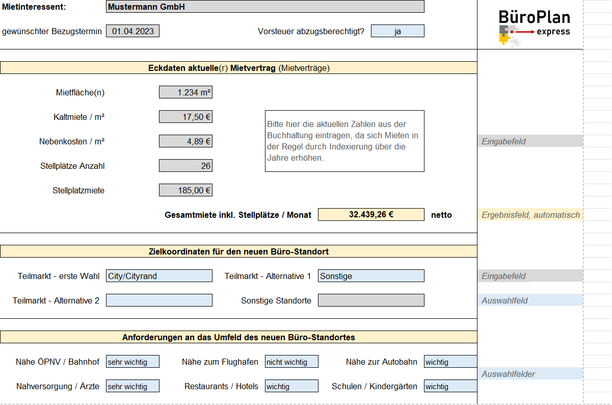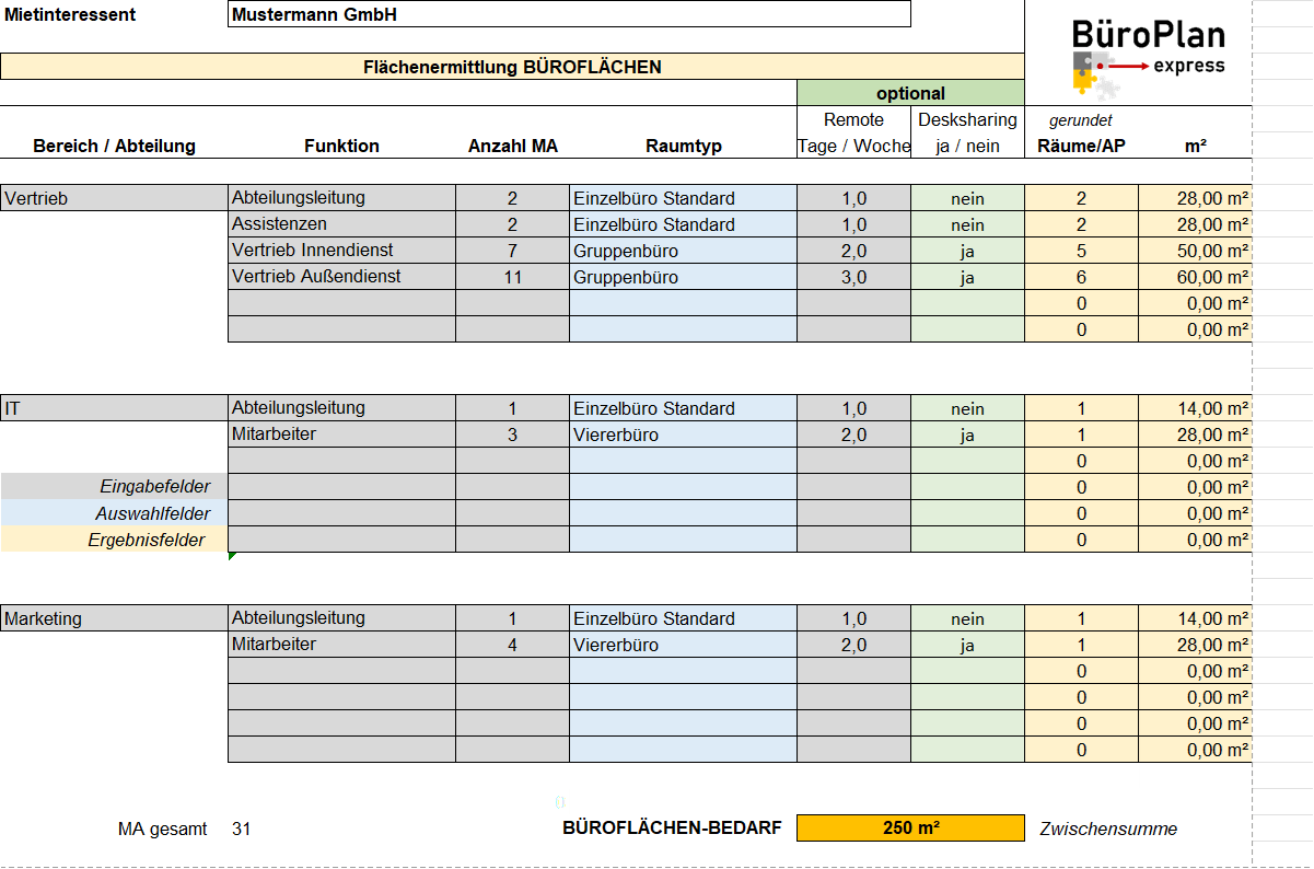 Mit meinem Excel-Tool zur Erstellung eines strukturierten Anforderungsprofils, setze ich neue Maßstäbe. Es ist übersichtlich aufgebaut, auch für Laien verständlich, und im Ergebnis die perfekte Vorlage für Makler (wenn das neue Büro noch gesucht wird), Vermieter (um die passende Fläche zu identifizieren) und Planer (die so wie ich nur so gut planen können, wie es die Vorgaben erlauben). Da ich zeitgemäß auch abfrage, wie viele Remote Tage pro Nutzergruppe geplant sind, und ob die höheren Abwesenheitsquoten die Wechselnutzung von Arbeitsplätzen (Desksharing) möglich machen, ist es so ganz nebenbei auch ein stragtegisches Planungs-Tool für Entscheider, mit dem man Einsparpotentiale grob kalkulieren kann.